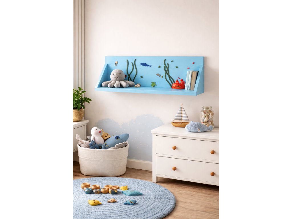 Ručně vyráběná dřevěná polička s motivem podmořského světa promění obyčejnou zeď v hravý, originální prostor.