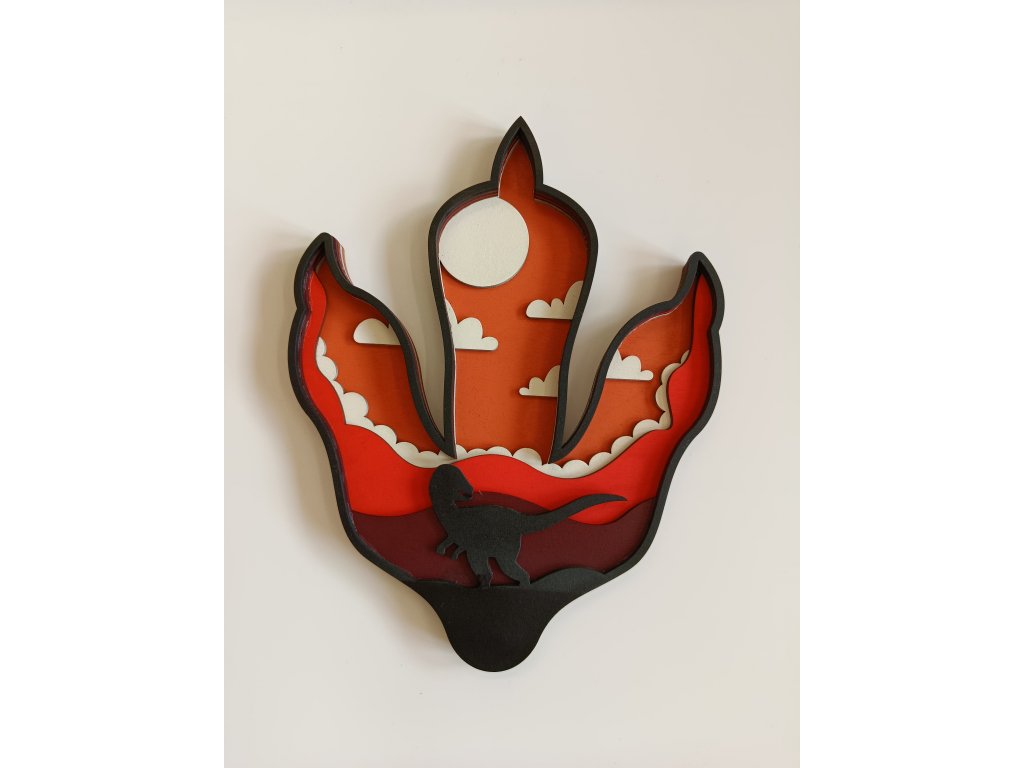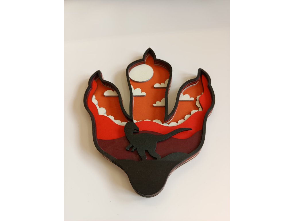 Originální dřevěná dekorace ve tvaru dinosauří stopy přináší do dětského pokoje kouzlo pravěku. Vícevrstvé provedení vytváří 3D efekt a při nasvícení jemně září ve tmě, takže se z ní stává nejen designový prvek, ale i uklidňující nočí světlo.