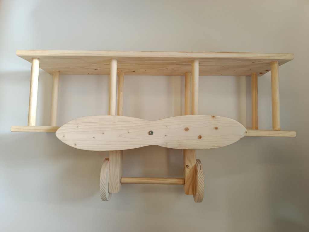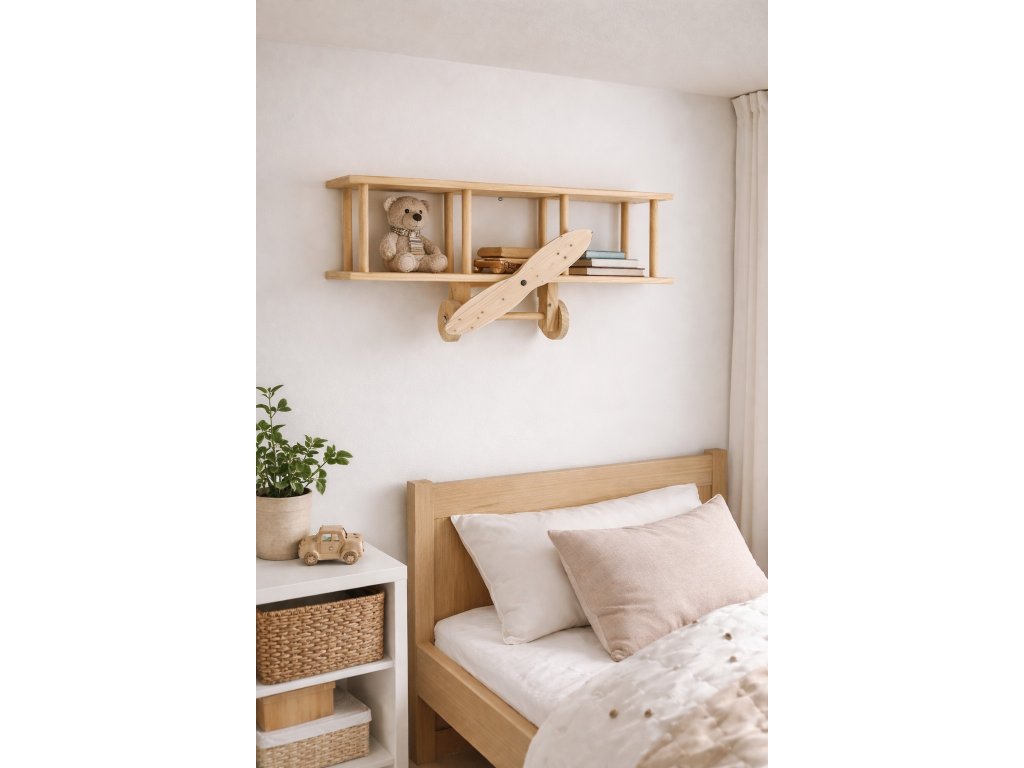 Tato polička dodá interiéru teplo a útulnost, zatímco praktické police nabídnou místo pro oblíbené knížky, hračky nebo dekorace. Díky neutrálnímu designu se hodí do moderních i skandinávských interiérů a roste spolu s dítětem - od miminka až po školáka. Naše polička Letadlo není jen úložný prostor - je to kousek, který podpoří dětskou představivost a dodá pokoji osobitý charakter. S vrtulí je možné otáčet.