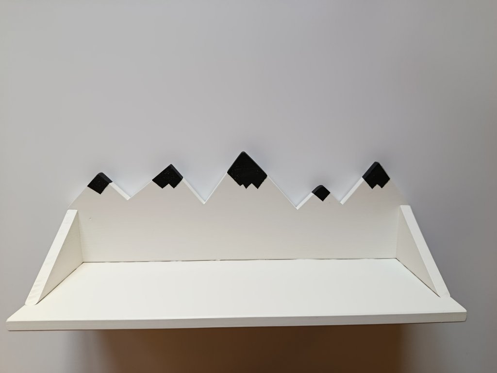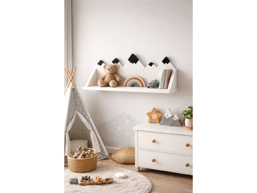 Originální dřevěná polička ve tvaru horského hřebene vnese do dětského pokoje klid přírody a dobrodružnou atmosféru.